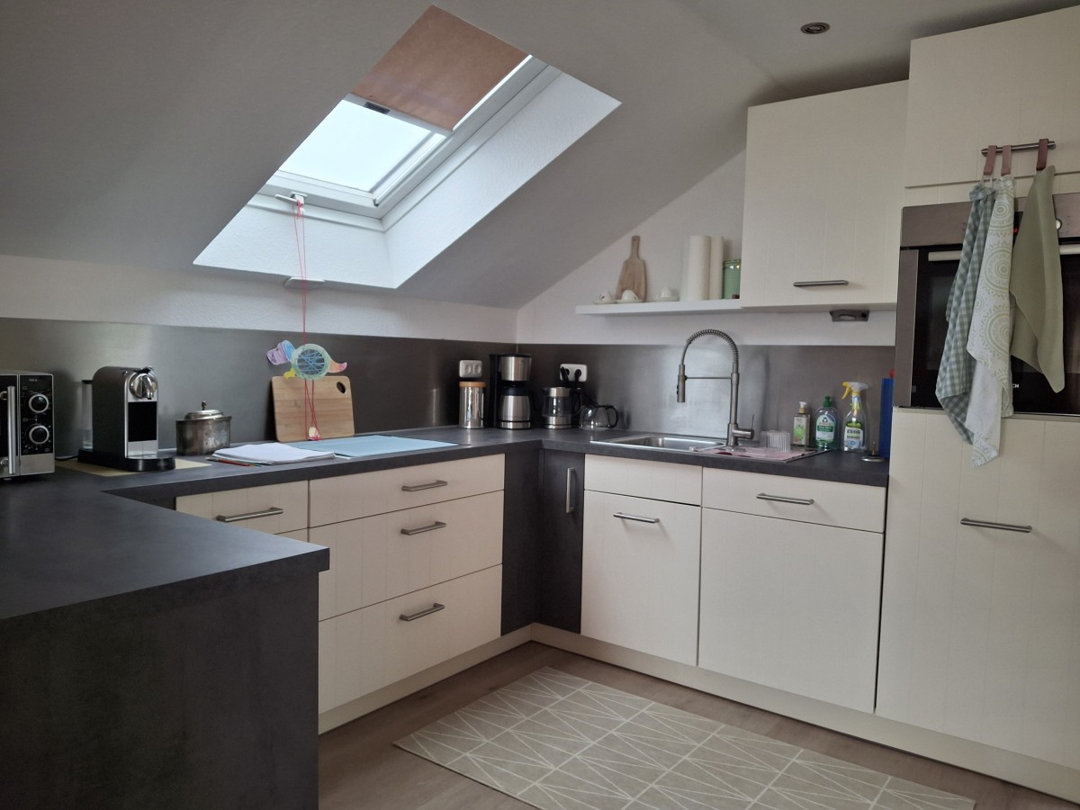 Die Einliegerwohnung im Dachgeschoss besteht aus einem Schlafzimmer mit Schrankraum, einem Wohnzimmer, einer Küche und einem Bad.